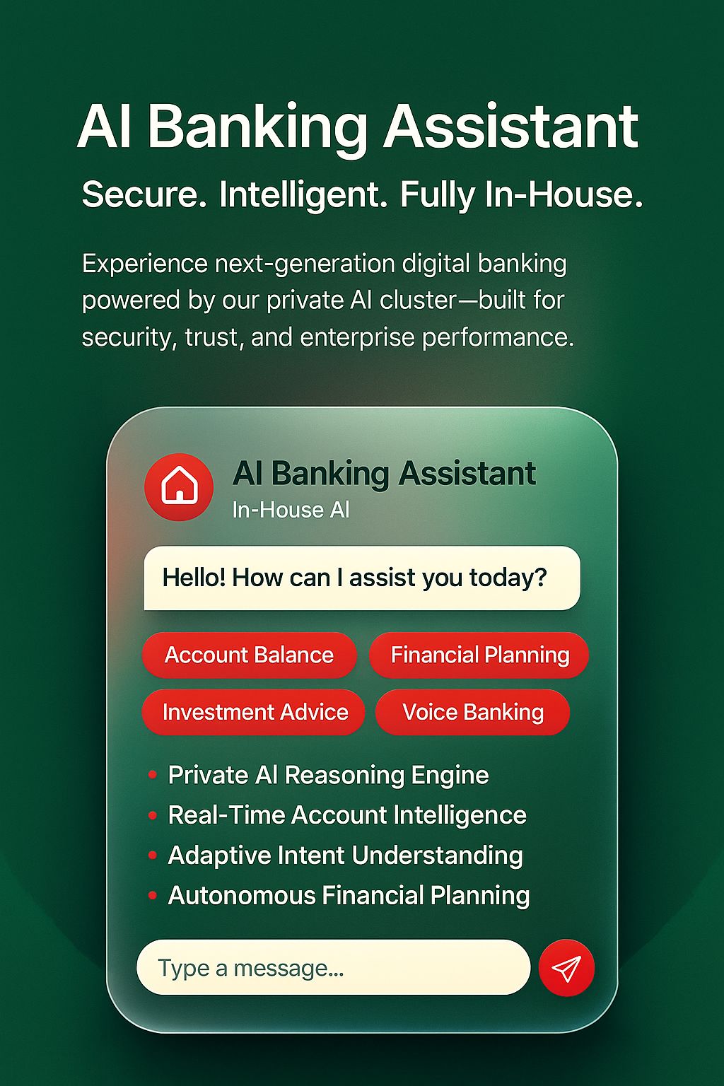 SecureBank AI is an advanced, multi-modal banking assistant designed to streamline digital banking through conversational AI. It offers secure authentication, real-time balance insights, personalized financial advice, investment planning, transaction analytics, and voice-enabled interactions. With a clean interface and AI-powered analytics dashboard, it delivers a seamless and highly intuitive customer experience for modern financial institutions..